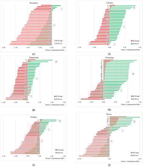 The honey contamination ratio (HCR) has been developed to assess MM contamination in terrestrial environments through the use of honey as a bioindicator. This calculation method was adapted from HCI, developed for honeybees by Goretti et al. [11]. HCR is calculated based on a combination of HCRhigh and HCRlow; this value allows the level of MM contamination level in honey to be compared with the content of elements in honey samples identified in EU countries and has the following attributes: