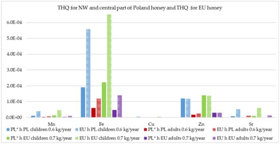 Greater awareness of environmental pollution brings forth the need for the proper management of plant and animal resources. Regardless of their particular characteristics, bees are inextricably linked with the environment that forms bee pastures; furthermore, as their flight radius typically extends only as far as 1.5 km from the hive, the concentration of pollutants in their bodies and in apiculture products is strongly determined by local pollution levels. Therefore, their concentrations in honey can be used as indicators of environmental pollution with heavy metals (HMs), xenobiotics, and radioactive substances [9,10,11,12]. Otherwise, the quality of honey depends on the region of its origin, i.e., the climatic conditions, plant resources, soil composition, water and air quality, as well as storage conditions [13,14,15]. Honey may contain non-biodegradable toxic elements originating from agricultural and industrial activities, coal combustion, deposition of atmospheric pollutants due to melting of the snow cover, combustion of municipal waste, and microplastic [16].