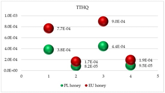 To compare the levels of MM contamination of the tested honey samples from NW and central Poland with those from other EU countries, HCR was calculated and interpreted for the 12 MMs present in all analysed samples.