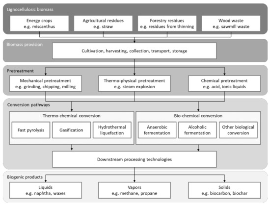 The demand for non-fossil alternatives for (bulk) chemicals, materials, and energy, as well as for selected services, is increasing rapidly to meet the European Green Deal mentioned above. Because of the growing demand for biomass-based (bulk) chemicals, the demand for the world’s limited agricultural land increases as new agricultural areas are needed. Additionally, several of the currently utilized crops for bioenergy provision can also be used to feed the global population, thus leading to a competing situation between food/feed production and biomass-based chemical production; one consequence is an effect on the prices for agricultural commodities. Lignocellulosic biomass offers an alternative to avoid competition with food and/or feed production. Usually, agricultural food crops gain (very) low yields on degraded or marginal land (e.g., land with an overall low productivity caused by climatic, edaphic, and/or anthropogenic conditions). Nevertheless, a variety of selected types of lignocellulosic biomass of woody and herbaceous origin have the ability to be grown on land that is poorly suitable for agricultural food crops [5,6], even though the hectare-specific yield is most likely quite low and thus the specific provision costs are relatively high. Nevertheless, the use of lignocellulosic biomass, i.e., (i) grown as energy crops on degraded or marginal land or (ii) collected from agricultural and forestry residues, is a viable option for the sustainable production of intermediate biogenic products within the European Union as well as on a global scale. This is true because the potentials of these resources are a priori limited.