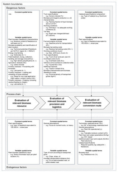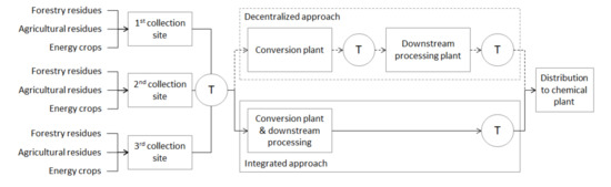 Two transportation routes or distances have to be determined. First, the transportation from the feedstock source to the conversion plant needs to be identified and, second, the route from the conversion plant to the chemical plant has to be determined. Table S2 in the Supplementary Materials shows the applied variables according to their categorization.