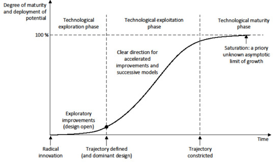 The assessment of the development of future conversion processes for lignocellulosic biomass is based on the approach of technical trajectories. For most technologies/processes that are applicable, a maximum degree of maturity can (and will mostly) be reached. In spite of their individual variances, technologies tend to follow analogue technical trajectories. This implies, first, the rate and direction of change and improvement (i.e., from initial innovation to maturity), and second, the market development (i.e., from introduction to saturation) [27]. In Figure 6, a typical saturation curve of a technology is displayed.