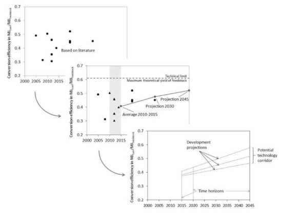 In addition, Figure 7 shows the basic methodology for determining future technical parameters such as, e.g., conversion efficiency. The key performance indicator identified for the conversion of lignocellulosic biomass is the utilization ratio of the plant. In this regard, the conversion efficiency is approximated to the theoretical maximum conversion efficiency with regard to future developments, and the results are accordingly given in a potential technical corridor in the medium- and long-term.