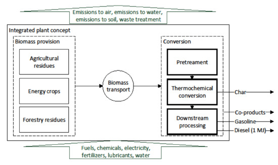 Already in 2018, the European Commission developed the European Bioeconomy Strategy to establish a more innovative and low-emission economy that reconciles the sustainable use of renewable biological resources and materials for industrial purposes with the preservation of biological diversity and environmental protection [3]. In view of this European Bioeconomy Strategy and the European Green Deal, the possibilities of using and providing (bulk) chemicals of biogenic origin for the chemical industry need to be analyzed. Biomass-based chemicals can supplement or replace fossil fuel-based chemicals within the overall production chain. The use of biomass-derived chemicals in industry requires biogenic feedstock to be produced, supplied, pre-treated, and converted. To enable the chemical industry to use biomass as a raw material in a most efficient way, the organic matter is converted, e.g., into liquid intermediates, and further processed in refineries. The respective new technologies and processes aim to meet the following criteria: (i) renewability; (ii) saving resources of fossil fuel energy; (iii) decreasing the environmental impact; and (iv) improving productivity and sustainability. The respective innovations to be realized within the relevant bioeconomy industries are conceivable and should therefore be methodologically accessible [4]. The methodical approach of this work is based on a technical–economic–environmental assessment.