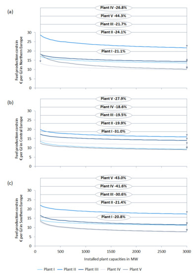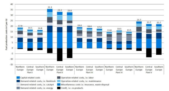For assessing the plant economics, the functional unit is defined as specific cost (i.e., fuel production costs). To carry out a comparison of the plant, a fixed reference value such as fuel production costs need to be defined (CC, specific costs, e.g., fuel production costs per unit; AC, annuity of capital-related costs; AD, annuity of demand-related costs; AO, annuity of operation-related costs; AM, annuity of miscellaneous costs; v, reference value, e.g., annual production) (Equation (15)).