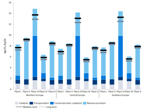 The developed methodology aims to provide a perspective for the future. The current status is compared with the medium-term (2030) and long-term (2045) developments within the EU-28. The thermo-chemical conversion pathways that have been exemplary evaluated are pyrolysis and gasification. The countries where the plants are located are in northern Europe, central Europe, and southern Europe, i.e., Sweden, Germany, and Spain.
