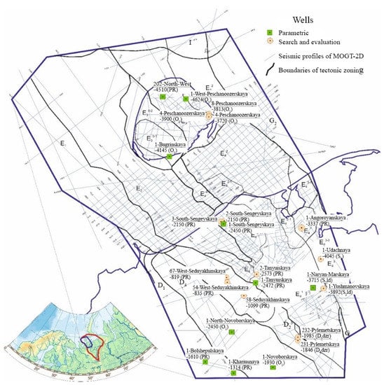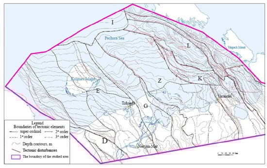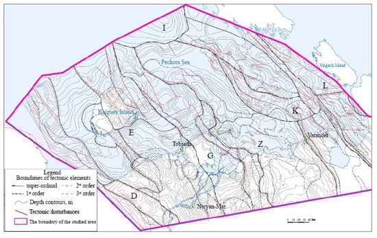In accordance with the oil and gas geological zoning of the Timan–Pechora oil and gas province, the research area includes the Seduyakhinsko–Kipiyevsky oil and gas region (OGR), belonging to the Izhma–Pechora oil and gas region (OGR) (only a small fragment is presented in the territory of the study), and the West–Kolguevsky, Naryan–Marsky, and East–Kolguevsky OGR, which are the part of the Malozemelsko–Kolguevskaya OGR [45,46,47].