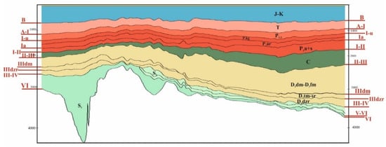 In the sedimentary cover within the studied area, the Cambrian-Lower-Middle Ordovician terrigenous, Middle Ordovician-Lower Devonian terrigenous-carbonate, Middle Devonian-Frasnian terrigenous, Domanik-Tournaisian carbonate, Upper Visean-Lower Permian carbonate, and the Upper Permian and Triassic terrigenous sediments that promise oil and gas complexes are distinguished from the bottom-up. The principal difference from the eastern regions is the reduced volume of the sedimentary cover from the Middle Devonian to the Jurassic deposits as well as the presence of graben-like deflections filled with Cambrian-Lower Ordovician terrigenous deposits (Figure 2) [30,43,44].