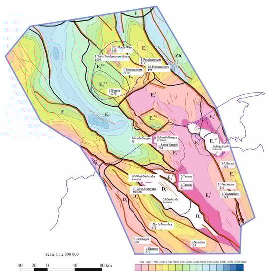 To assess the reliability of fluid traps and the generation potential of oil source rocks, the results of the logging data analysis for deep wells extrapolated to the territory of the entire site were used. The surfaces of fluid traps and oil source rocks were calculated by the method of convergence in the gap between the main structural horizons, by a proportional division of the thickness between the main deep surfaces. The correction of the depth reference was made based on the borehole data, where it is possible. To assess erosion, it was assumed that the maximum apparent thickness of the eroded complex was almost equal to the thickness of the complex before erosion. Furthermore, the amount of erosion was calculated as the difference between the maximum thickness and the current thickness. At the same time, the paleoterrain at the time of the formation of the analyzed complex was noted, and the thickness of the filling of paleotroughs was excluded from the calculation, for which the correlation of additional horizons was performed [40,48,50].