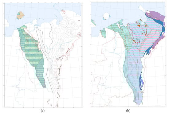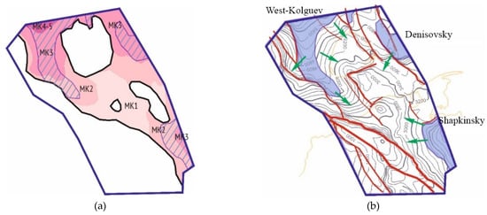 (a) Scheme of catagenetic zonality of Upper Silurian deposits [47]; (b) Scheme of the development of the center of generation and the migration direction of the HC of the Malozemelsko–Kolguevskaya monocline and the zones of its junction with adjacent territories [42].