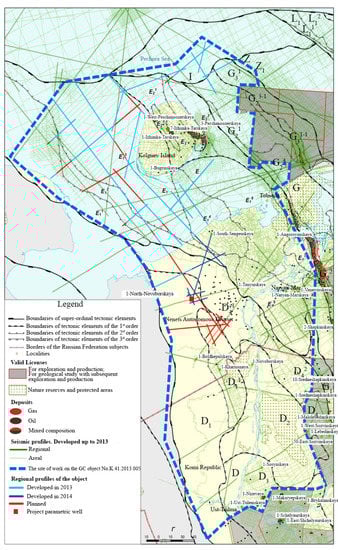 Regional structural constructions made it possible to clarify the tectonic and oil and gas geological zoning (Figure 6) [46,47].