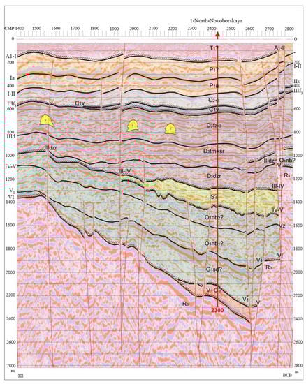 Interpretation of seismic data and borehole materials was made for the purpose of structural constructions on reflecting horizons (RH): VI (foundation surface), V-V1 (acoustic roof surface of Ordovician terrigenous deposits), IV (roof of Silurian deposits), III-IV (roof surface of Silurian-Lower Devonian deposits of different ages), III2 (surface of Middle Devonian-Lower Frasnian deposits), IIIdm (solely Domanik deposits), IIIfm1 (acoustic surface of Famennian deposits), IIv (roof surface of Visean deposits of the lower carboniferous), Ia (horizon, separating the carbonate and terrigenous part of the Lower Permian), A-I (the roof of the Lower Triassic), and B (the horizon in the Jurassic sediments). The seismogeological model created in the PC Kingdom was the basis for clarifying the tectonic and oil and gas geological zoning of the northern part of the Timan–Pechora province, including the waters of the Pechora Sea (Figure 3).