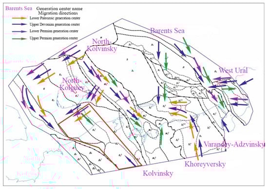 The scheme of the distribution of the centers of oil and gas generation of hydrocarbons in the water area of the Timan–Pechora basin is shown in Figure 10.