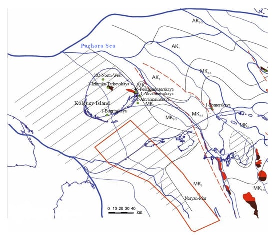 The research area is characterized by a very reduced range of industrial oil and gas content, established only on Kolguev Island, despite the fact that in the northern part of the land area of the TPP or the eastern part of the research area, the range of industrial oil and gas content is very significant—with deposits from the Lower Silurian to the Middle Triassic [40,41,42].