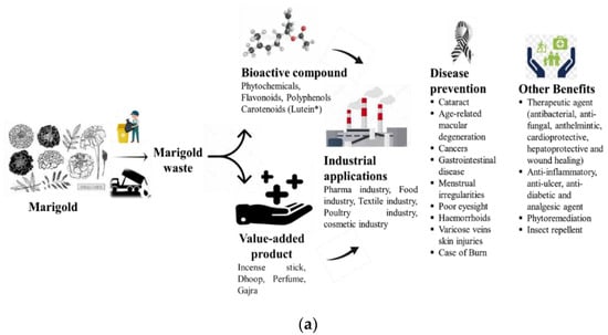 The municipal authorities in developing nations such as India have a serious challenge managing marigold garbage. Marigold waste is typically disposed of in landfills by municipal authorities. The primary issue with the flowers is that they are never reused and are instantly wasted after being offered to deities. This article deals with the reuse of marigold waste, especially Tagetes erecta, Tagetes patula, and Calendula officinalis L., especially for carotenoids (lutein), along with other value-added products, such as phytochemicals and flavonoids, by direct extraction, which has several applications, as well as by manufacturing valuable products such as incense sticks, dhoop, etc., as shown in Figure 1a. On the other hand, many industries utilize marigold waste through bioprocessing and produce high-demand biofuels, such as biogas and bioethanol (shown in Figure 1b). The applications of lutein and other products are well-known to consumers. Moreover, marigold-derived flavonoids are used as good therapeutic agents and have several therapeutic effects, such as antiviral, antioxidant, cardioprotective, and wound-healing effects, as shown in Figure 1. This article also discusses the pre-treatment, drying, and filtration processes of marigold flowers, as well as an efficient methodology for the extraction of lutein from marigold waste. Marigold plants are employed for phytoremediation during the growing stages and in later stages, and they serve as a useful feedstock for lutein extraction. Due to carotenoids and other value-added products’ extraction, marigolds are commercially important and, thus, have found a wide range of applications in both health and non-health sectors.