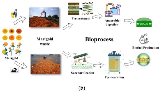 Marigold waste valorization: (a) direct extraction of valuable products and their applications; (b) schematic illustration of bioprocess steps for biofuel production.