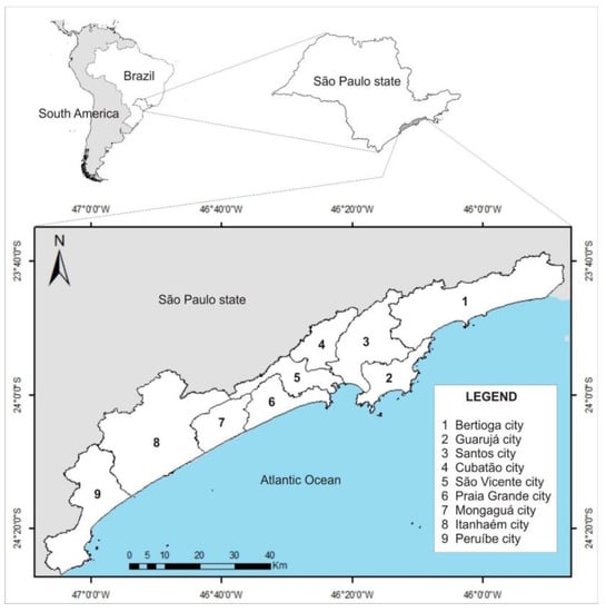 The Baixada Santista is an administrative region of the state of São Paulo, Brazil, located in the central part of the coast, composed of nine municipalities: Bertioga, Guarujá, Cubatão, Santos, São Vicente, Praia Grande, Mongaguá, Itanhaém, and Peruíbe (Figure 1).
