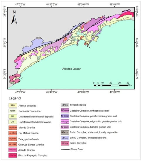 The Ribeira Belt is divided into five terrains: Embu, Curitiba, Luis Alves, Paranaguá, and Costeiro. Baixada Santista is inserted in the Embu and Coastal Terrane (Figure 2), which are limited by the Cubatão Shear Zone []. The Embu Terrane presents high-grade metamorphic rocks intruded by a series of granitic bodies elongated in the NE–SW direction. The authors of References [,] identified granitic magmatism of ca. 590 Ma and [] dated the main metamorphic event at 790 Ma. In the Coastal Terrane, metasedimentary successions with high amphibolite to granulite facies are found [], with metamorphism peaking at 745 Ma []. Granitic magmatism of about 630 Ma with a subsequent metamorphic event in 570 Ma was identified [].