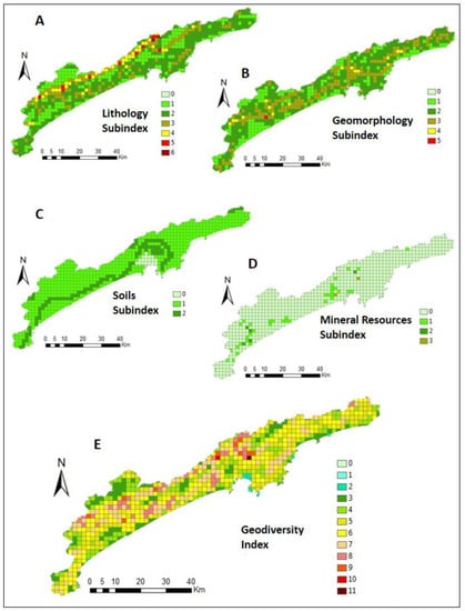 The geodiversity index map (Figure 3) is the result of the integration of the lithology, geomorphology, soils, and mineral resources subindices. The lithology subindex (Figure 3A) ranges from 0 to 6. Among all the subindices, this was the one that achieved the greatest variety. The highest values are distributed in the NE–SW direction, and the cell with the highest value (6) is located in the northern part, where there is a variety of different lithological units and lineaments. The cells with the lowest value are distributed in the areas near the coast.