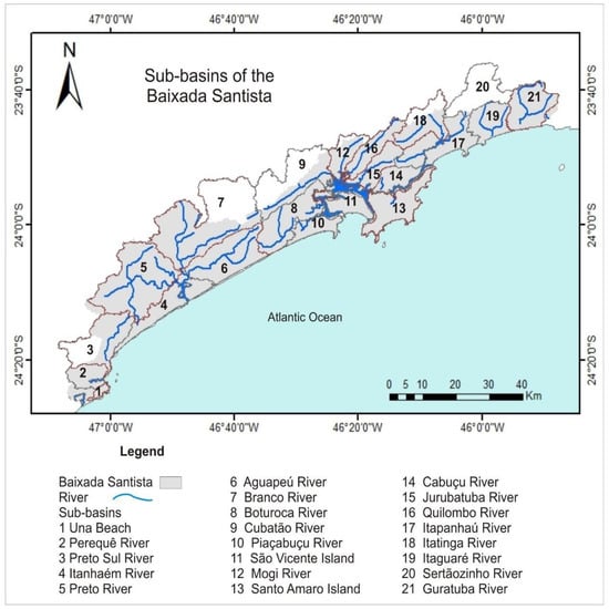 Sub-basin drainage areas of the Baixada Santista, State of São Paulo, Brazil. Source: [].
