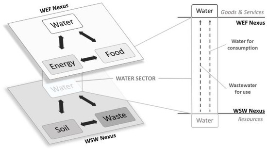 While water is part of the ‘original’ Water-Energy-Food Nexus, considerations of waste(-water) are particularly dominant in the Water-Soil-Waste Nexus []. Nexus thinking, in essence, intends to understand interlinkages across resources or sectors that involve biophysical, social, economic and social aspects []. A sector considers both the resource and the goods and services that are derived from it. For instance, the Water-Soil-Waste Nexus (WSW) focuses on resources [], whereas the Water-Energy-Food Nexus (WEF) can be interpreted as focusing on the goods and services provided by these resources []. Thus, the water sector comprises the interlinkages and management related to water resources as well as services of supplying water for human use (a good) or collecting and treating wastewater, as shown in Figure 1. Additionally, since the issue of sustainable wastewater management often deals with the impacts of the lack of (adequate) wastewater treatment, interlinkages between wastewater management and water and crop management can be considered as further aspects for assessment. In that sense, seeing wastewater management through a nexus lens can open new perspectives in debates on how to achieve sustainability of wastewater treatment systems going beyond fine-tuning technical equipment of treatment facilities and entering the realm of ecological and social innovations.