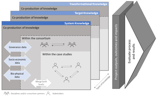 This study also showed that lack of data hinders demonstrating a holistic picture of sustainability, and that considering aspects such as stakeholder perception and how to shape policies in the face of wicked problems, can effectively show longer-term pathways towards systemic change and sustainable solution options. This is key, since a large focus of the nexus research community has been on better understanding interlinkages in bio-physical systems with little social or behavioural information. Numerical model outputs are often hampered by lack of data []. It may therefore be advisable to move beyond the improvement of numerical models that focus on increasingly interlinked systems understanding towards the co-production of knowledge with tools that provide information on (1) all three levels of knowledge, (2) within different stakeholder groups—project team, case study stakeholders, others, and (3) making use of diverse data sets (Figure 4).