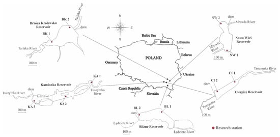 Location of reservoirs and sampling stations on the Cierpisz, Brzóza Królewska, Nowa Wieś, Kamionka, and Blizne reservoirs.