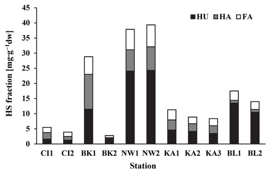 The modified Griffith-Schnitzer fractionation method was used to determine the content of humic substance fractions in the bottom sediments [30,36,37]. An aliquot of 2–5 g of the sediment was shaken with 50 cm3 of NaOH solution (0.1 mol∙dm−3) for 16 h in a previously weighed centrifuge tube. Before shaking, the free space of the tube was purged with N2. The extract was separated from the sediment. In part of the extract, the organic carbon content of the humic acid fraction (HA + FA) was determined. The remainder was acidified to pH 1.0–1.5 and left overnight to precipitate the humic acids (HA). After the separation of HA, the organic carbon content of the fulvic acid (FA) fraction was determined. The sediment remaining from the extraction was mixed with 50 cm3 of H2SO4 (0.5 mol∙dm−3) and heated in a water bath for 1 h at 80 °C. The obtained extract was discarded. The remaining sediment was dried at a temperature of 80 °C to a constant weight (24 h), and the organic carbon content of the humin fraction (HU) was determined. The concentration of organic carbon in the extract solutions after neutralization was determined using a TOC-VCPN analyzer (Shimadzu). The organic carbon content in the extraction residue was determined with a CNS elemental analyzer, Flash EA 1112 (Finnigan Mat). The organic carbon content of the humic acid fraction (HA) was calculated from the difference between the organic carbon content of the humic acid fraction (FA + HA) and the organic carbon content of the fulvic acid fraction (FA). The organic carbon content of humic substances (HS) was the sum of FA, HA, and HU. The sediment samples were analyzed in three replicates for which the relative standard deviations (%RSDs) were less than 10% for all HS fractions. An internal laboratory reference material (LRM) was used for quality control, in which the total organic carbon content of HS was determined by an accredited laboratory as part of interlaboratory comparative tests. The recovery of the HS fraction [mgC∙g−1] achieved by the sequential extraction technique was assessed by comparing the sum of HS fractions extracted in two stages (FA + HA and HU) with the total content of HS determined in an internal standard. The percentage of the HS recovery ranged from 91.4% to 107.5% (for 5 control samples).