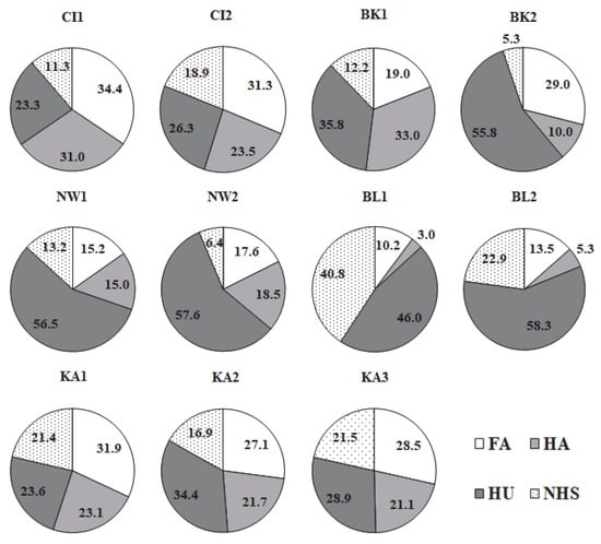 The share of individual HS fractions [%] in Corg. in the bottom sediments of the studied small retention reservoirs. NHS, non-humic substances.