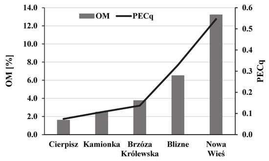 The comparison of the studied reservoirs in terms of the increasing average OM content and the risk index of their ecotoxic effect on aquatic organisms (PECq) (Figure 4) indicates a possible relationship between the accumulation of heavy metals and organic matter in the bottom sediments of small retention reservoirs. According to El-Radaideh et al. [50], the content of organic matter (total) and the grain size of the sediment are the main factors determining the concentration of heavy metals. Many authors emphasize the relationship of heavy metals with the enrichment in OM in the sediments of dam reservoirs [11,12,51]. The smallest granulometric fractions show a high ability to adsorb metal cations [1,17,52].