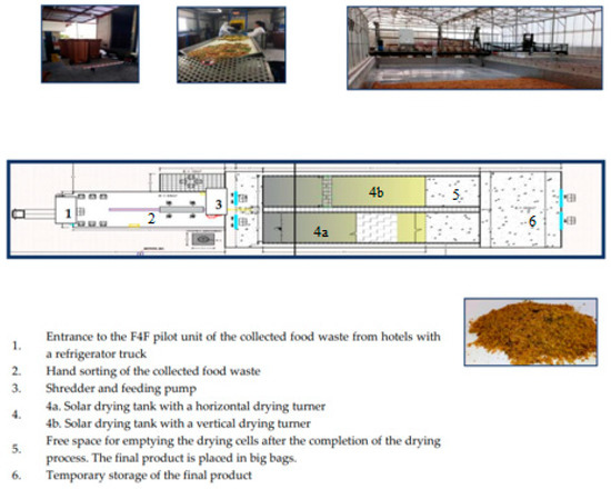 The F4F pilot unit consists of (i) a prefabricated building (14 m × 6 m) where food waste pre-treatment takes place and (ii) a solar drying unit (30 m × 12.8 m). A series of air-conditioning and air extraction and recirculation units (for health and safety issues) have been installed in the prefabricated building. The F4F pilot unit is installed in the city of Heraklion on the island of Crete and is schematically depicted in Figure 1.
