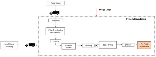 The goal of the present study is the environmental impact assessment via means of life cycle assessment (LCA) of the installation and operation of the pilot scale solar drying unit designed, constructed, and operating in the framework of the F4F project. LCA is an established decision support tool for the comparison of different food waste management systems [16]. Recently, researchers requested comprehensive LCAs to assess the environmental benefits of replacing feed grains with by-products or food waste [17] and to valorize meat waste for pet food production [18]. Our study aims to answer the following research questions: (i) what is the most important environmental burden during the installation of the drying unit’s infrastructure, (ii) how does installation infrastructure compare with the operation of the drying unit in terms of environmental impacts, and (iii) what is the avoided energy burden of the food waste drying process attributed to the utilization of solar power.