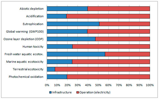 With regard to the comparison between infrastructure and operation, Table 4 and Figure 4 reveal the fact that operation is the key contributor to eight of the impact categories examined, including global warming. The main operational burden is placed on the use of electricity. On the basis of our data, the use of electricity is estimated to be 200.5 KWh per ton of incoming food waste. This value is 4–12 times higher compared with that which was reported for composting of food waste by a review paper [21]. This is due to the solar drying pilot unit not operating at its maximum capacity and the differences in system-boundary settings and assumptions that were used [21]. Note that the penetration of renewable energy sources into the Greek electricity grid is increasing significantly each year, and, thus, the current relative characterized impacts are expected to decrease.