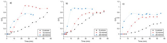 Effect of flow rates on breakthrough curves for ammonium adsorption on analcime geopolymer at a fixed-bed height of 0.5 cm and a concentration of 40 mg/L. (a) GEOP1; (b) GEOP2; (c) GEOP3.