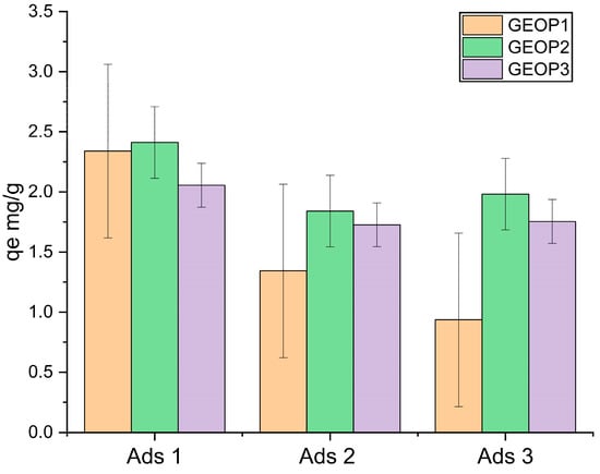 The specific surface area, pore size and pore volume are listed in Table 1. The highest pore size was found for GEOP 1 and lowest surface areas for GEOP1. Each sorbent displayed the characteristic of having a mesopore structure. Pore size of the analcime-based geopolymer are higher than NaP zeolite adsorbents (3.0 nm) [43] and coal-analcime adsorbents (9.02 nm) [44]. Non modified analcime has lower surface area (3.01 m2/g) than analcime-based geopolymers [45]. Geopolymers usually act as effective ion exchangers [17] and surface area does not have much of an effect in adsorption. However, this study’s results show that the surface area of the material enables ion exchange as the surface of the sample has mesoporosity, which contributes to the adsorption capacity of ammonium ion.