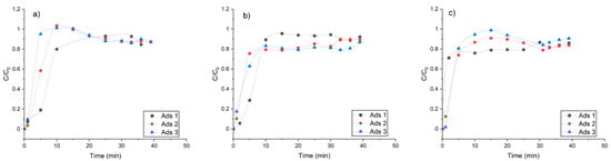 Breakthrough curves for adsorption–regeneration into the analcime geopolymer at 20 mL/min flow rate and a fixed-bed height of 0.5 cm. (a) GEOP1; (b) GEOP2; (c) GEOP3.