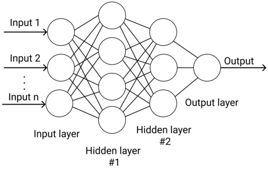 The most commonly used type of neural network method is the multi-layered perception method. In this method, the signal is passed to a one-way loop-free input-to-output network. Neither neuron acts on itself. This architecture is referred to as feed-forward, and consists of multiple inputs, hidden layers, and an output, as shown in Figure 3.