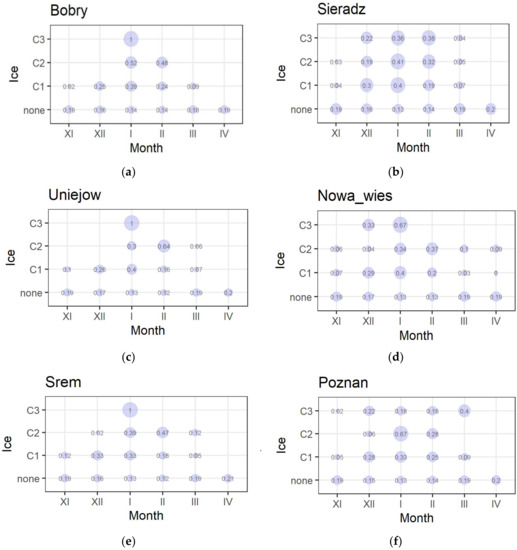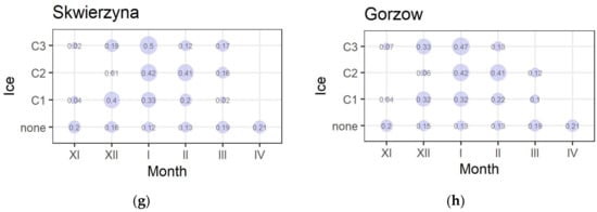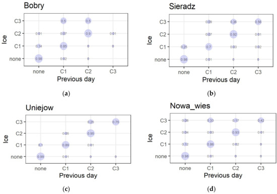 The results of the analysis of ice phenomena as sequential phenomena have been presented in Figure 6. The cross tables compare ice phenomena from the current day with the phenomena of the previous day. It was noted that each class was most often preceded by a phenomenon from its class. Additionally, there was often no ice at all at the river stations the day before the occurrence of ice phenomena from class 1. In a small percentage of days, ice phenomena from class 1 preceded class 2 events. Class 3 occurrences were regularly preceded by phenomena from classes 1 and 2 (Figure 6).