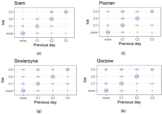 Figure 6. Probability of the order of occurrence of ice phenomena classes (none, C1, C2, C3) as a function of the ice phenomenon of the previous day for the water gauge stations on the Warta River. Note: Water gauge stations are labeled in the order (ah), according to their location on the river (from upper to lower course).