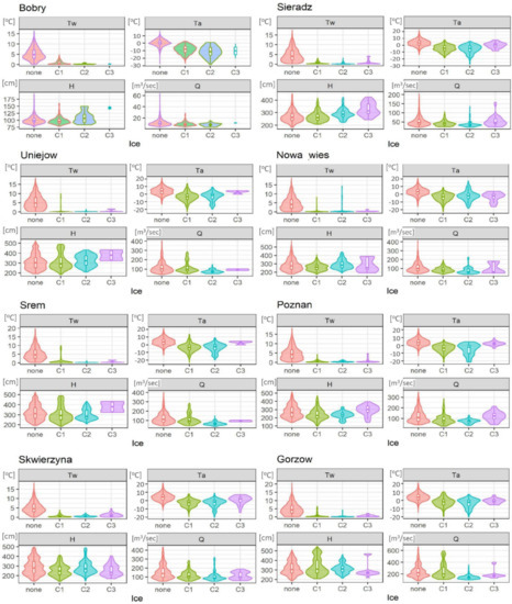 The assessment of the relationship between various classes of ice phenomena and thermal conditions and hydrological factors has been presented in the form of violin plots of the distribution of these parameters for each class of the phenomenon. Figure 7 shows the differentiation of the variables with respect to the water gauges. For each water gauge station on the Warta River, the differentiation of the occurrence of ice phenomena in relation to air (Ta) and water (Tw) temperatures as well as water level (H) and flow (Q) was presented. As drawn, the graphs indicate certain regularities of occurrence of ice phenomena on the river.