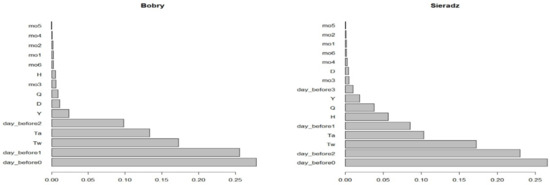 where ice_0 means no ice phenomena, ice_1–3 is the classes of ice phenomena (classes 1–3 adopted on the basis of the classification and grouping of ice phenomena presented in Table 1), Ta is air temperature, Tw is water temperature, Q is river flow, H is water level, D is day of the month, Y is day of the year, day_before0 is day before the day with no ice phenomena (class “none”), day_before1–3 means the day before occurrences of ice phenomena from classes 1, 2, 3 and mo1–6 means months in the winter half-year (November– April, according to the hydrological year).