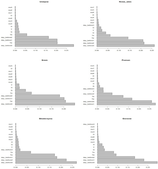 The second model tested was the Extreme Gradient Boosting (XGBoost) implemented by Chen et al. [54]—also in the form of the XGBoost library for the R platform. The gradient boosting machine is a team learning technique based on decision trees. A decision tree generates an output variable estimate based on optimized predictor thresholds that divide the data into multiple groups. The gradient boosting algorithm in each subsequent step aims to reduce the prediction error of the previous step. Technically, in each subsequent step the algorithm estimates the parameters of the model whose purpose is to predict the residuals (prediction errors) of the model estimated in the previous step. The objective function (J) in round t (step t) is given by Equation (4) [54]: