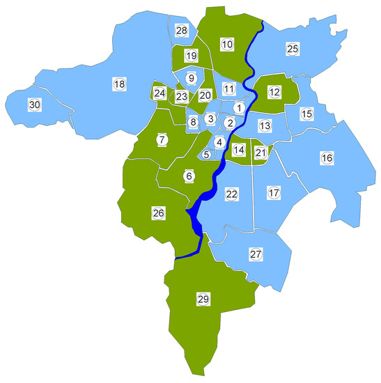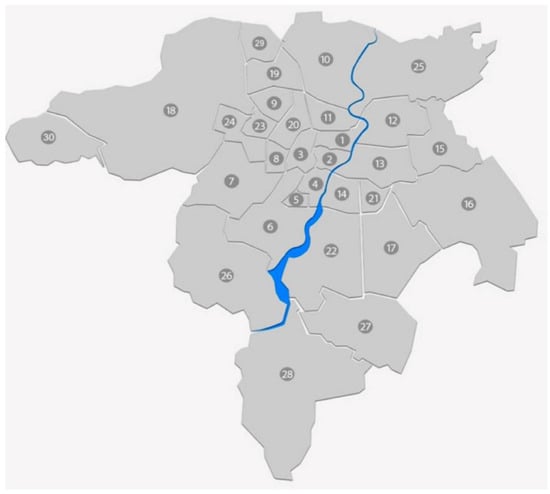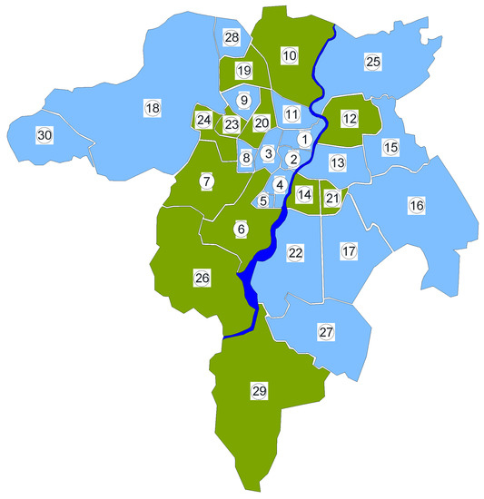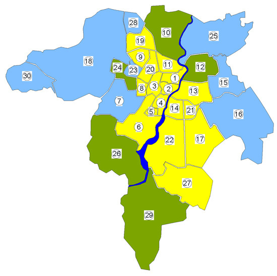 The research object is the water distribution subsystem of one of the largest cities in southeastern Poland. The analyzed city is the capital of the Podkarpackie Province. It is the seat of local and provincial authorities, as well as government and judiciary institutions. It plays the role of an important center of the aviation, commercial and service and construction industries. According to the data from 1 January 2021, the city had 197,863 inhabitants. The analyzed water supply network works in a closed system in 80%. The network cooperates with two groups of clean water tanks: ZB1 and ZB2, located in the eastern and western parts of the city. The whole water supply network consists of four main water mains transporting water from the second-degree pumping station located on the water treatment plant ZUzW (Figure 1) and Figure 2 shows the city divided into particular zones.