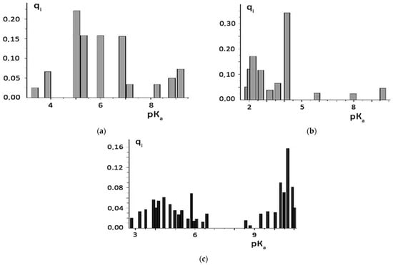 The detected intense lines at pKa near 7.0 (Figure 2a) emphasizes the presence of surface neutral centers in blue montmorillonite-containing clay [21], which simultaneously function as donors and acceptors. The natural sample also has Brønsted centers (pKa working area of 5.0–6.0). The possibility of the presence of Brønsted surface centers, which have pKa from 5.0 to 6.0, in such aluminosilicates is shown in [21] and the works of M.A. Ryazanov and B.N. Dudkin. They are formed with the help of hydroxyl groups at the vertices of montmorillonite tetrahedra, prone to protonation.