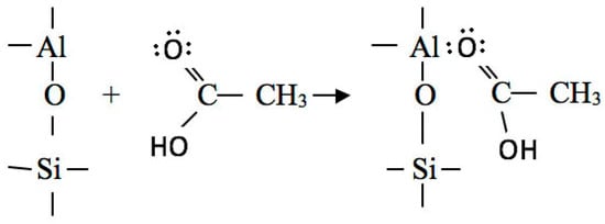 As a result of spraying acetic acid solution on the surface of the raw material (dissociation constant K = 1.8 × 10−5), only a weak line remains on the histogram at pKa = 5.7–6.1 instead of three clear lines in the “neutral” region (Figure 2b). In this case, the total concentration of acid sites increases sharply (Figure 2b, region 1.8–4.2) as a consequence of the binding of carbonyl oxygen according to the reaction, Figure 3 [30]: