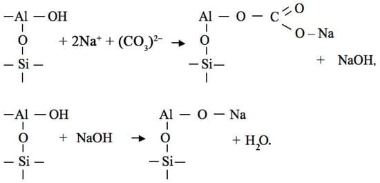 The introduction of sodium carbonate into the system after treatment with acetic acid promotes the appearance in the pKa spectrum of a cascade of lines in the range 8.7–11.2 (Figure 2c). This indicates the formation of new basic Brønsted centers (the bond between oxygen and hydrogen atoms in the hydroxyl group is strengthened). At the same time, the resulting hybrid material is characterized by a high concentration of acid sites on the surface (scattering of lines at рКа from 2.8 to 5.3). When the metal electron takes its place on the oxygen orbital, the acid Lewis centers make contact with the oxygen atom of the alkaline, modifying the additive according to reactions, Figure 4 [30]: