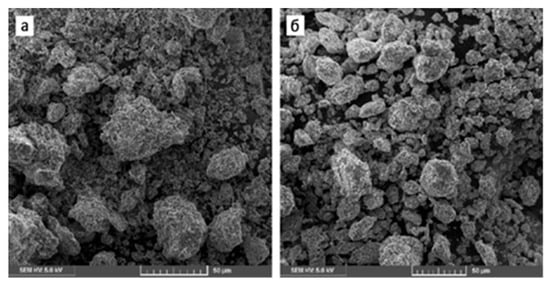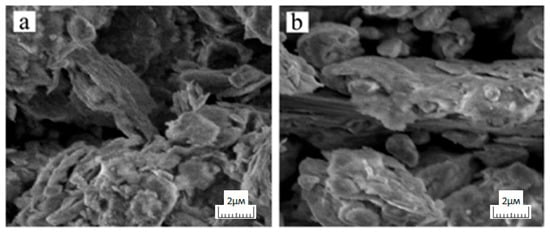 Montmorillonite in its natural form and modified state [31] is of great interest to researchers as a sorption-active material. The scanning electron microscopy studies of the surface of blue clay, consisting mainly of SiO2 compounds and montmorillonite, showed that particles of 1–2 µm in size predominate in natural raw materials (Figure 5a).