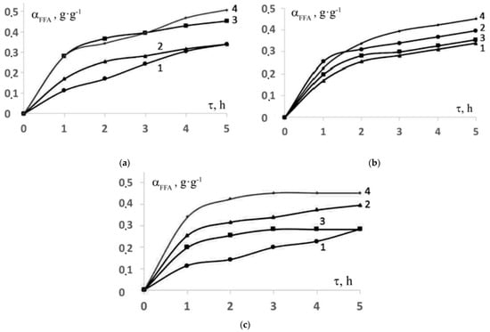 Figure 8. Extraction of free fatty acids of linseed oil during processing with natural (1, ac) clays and composites with the inclusion of oxalic (2), succinic (3) acids, oxalic acid and Na2CO3 (4); (a)—blue; (b)—pink; (c)—green.