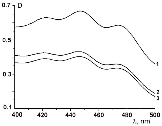 The absorption spectra of linseed oil revealed the presence of dyes. These are unsaturated hydrocarbons (lycopene, maximum at 475 nm), flavoxanthins C40H56O3 (λ = 422 nm), and their mixtures with luteoxanthins (maximum at 447 nm) (Figure 9). The oxidized hydrocarbon forms, which include oxygen atoms and are called xanthophylls, are valuable biological compounds and, together with lycopene, form the total carotenoids of vegetable oils.