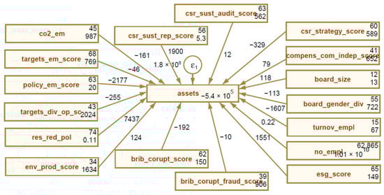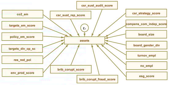 where: “assets—total assets of the company; co2_em—total CO2 equivalent emissions to revenues; targets_em_score—targets emissions score; policy_em_score—policy emissions score; targets_div_op_sc—targets diversity and opportunity score; res_red_pol—resource reduction policy score; env_prod_score—environmental products score; csr_sust_rep_score—CSR sustainability reporting score; csr_sus_audit_score—CSR sustainability external audit score; brib_corupt_score—policy bribery and corruption score; brib_corupt_fraud_score—bribery, corruption and fraud controversies score; compens_com_indep_score—compensation committee independence score; csr_strategy_score—CSR strategy score; board_size—board size; board_gender_div—board gender diversity; turnov_empl—turnover of employees; no_empl—number of employees; esg_score—ESG score; θi—variable that captures the country effects; ε—error term (residual variable)”.